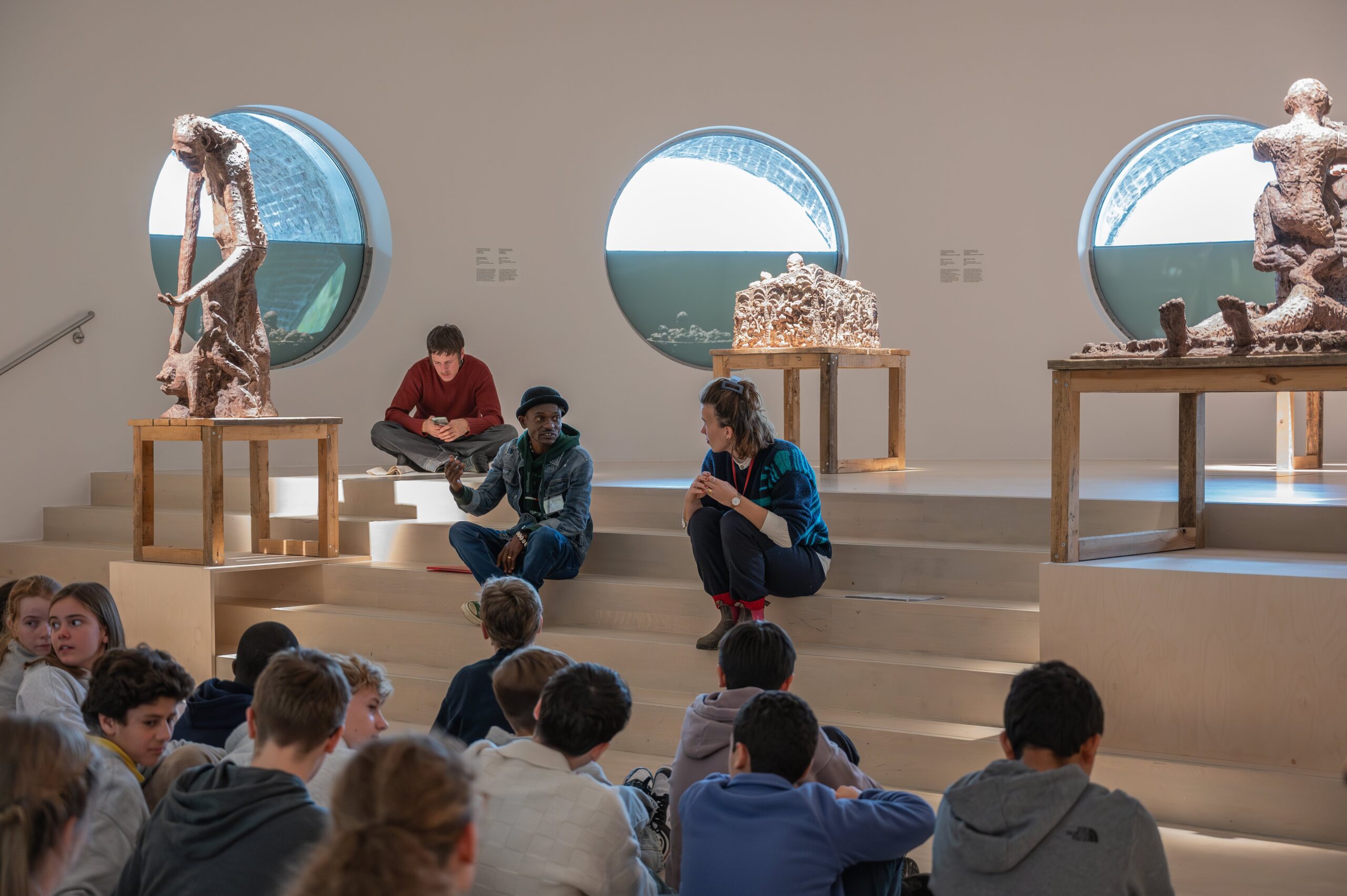 Ced’art Tamasala in conversation with students from Lycée Français. © K21 Kunstsammlung Nordrhein-Westfalen, photo: Linda Inconi-Jansen